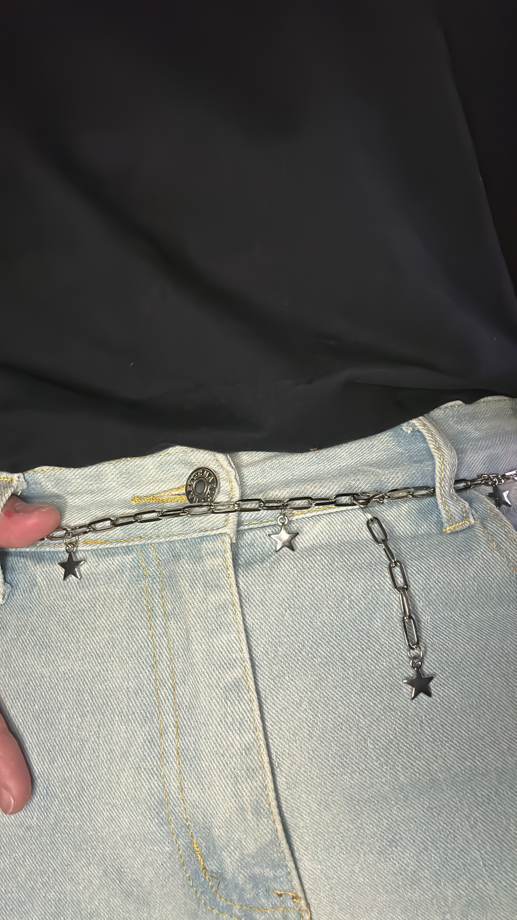 Corrente de elos inoxidáveis com pingentes inoxidáveis de estrela com fecho mosquetão, sensacional pra usar em calças, shorts ou bermudas! O cinto dá uma volta completa na cintura, como um cinto normal, conforme as fotos.