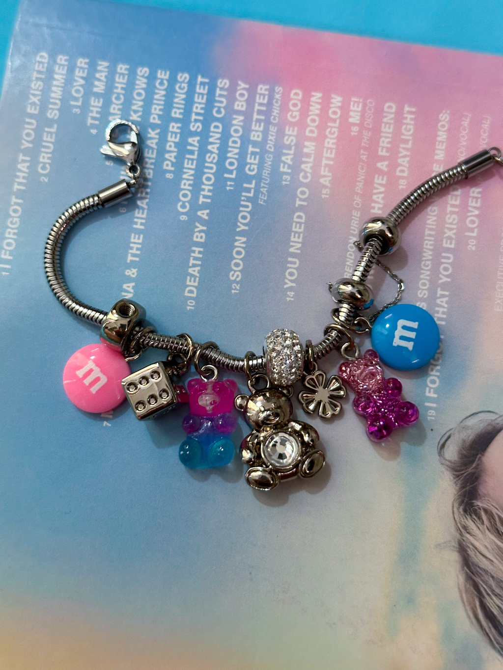 Pulseira regulável no aço inoxidável, pingentes de aço e resina de alta qualidade, um toque divertido e descontraído para o seu look! 🧸